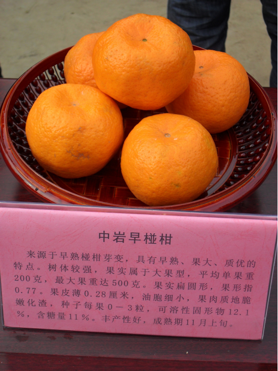 来源于早熟椪柑芽变,具有早熟、果大、质优的特点。树体较强,果实属于大果型,平均单果重200克,最大果重达500克。果实扁圆形,果形指0.77。果皮薄0.28厘米,油胞细小,果肉质地脆嫩化渣,种子每果0-3粒,可溶性固形物12.1%,含糖量11%。丰产性好,成熟期11月上旬。