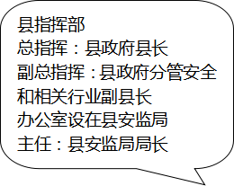 县政府是全县事故灾难应急管理工作的行政领导机构,研究决定、部署和推动全县事故灾难应急管理工作。成立县事故灾难应急指挥部(以下简称“县指挥部”),负责事故灾难的指挥和协调。县指挥部办公室设在县安监局,办公室主任由县安监局局长担任。