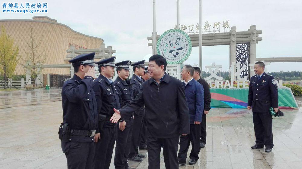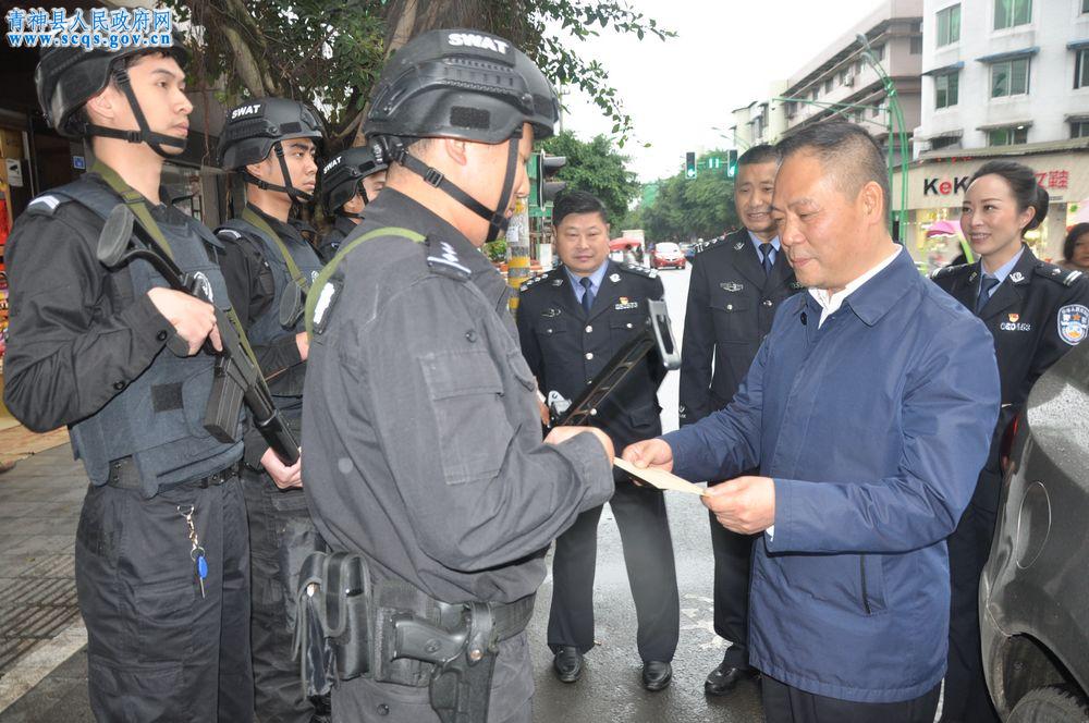 领导重视,到一线慰问,上一线指导——省厅党委委员、副厅长刘志刚(右四)率省委维稳工作集中督查第十七督查组到青神县竹博馆广场慰问一线民警,极大地鼓舞了士气。