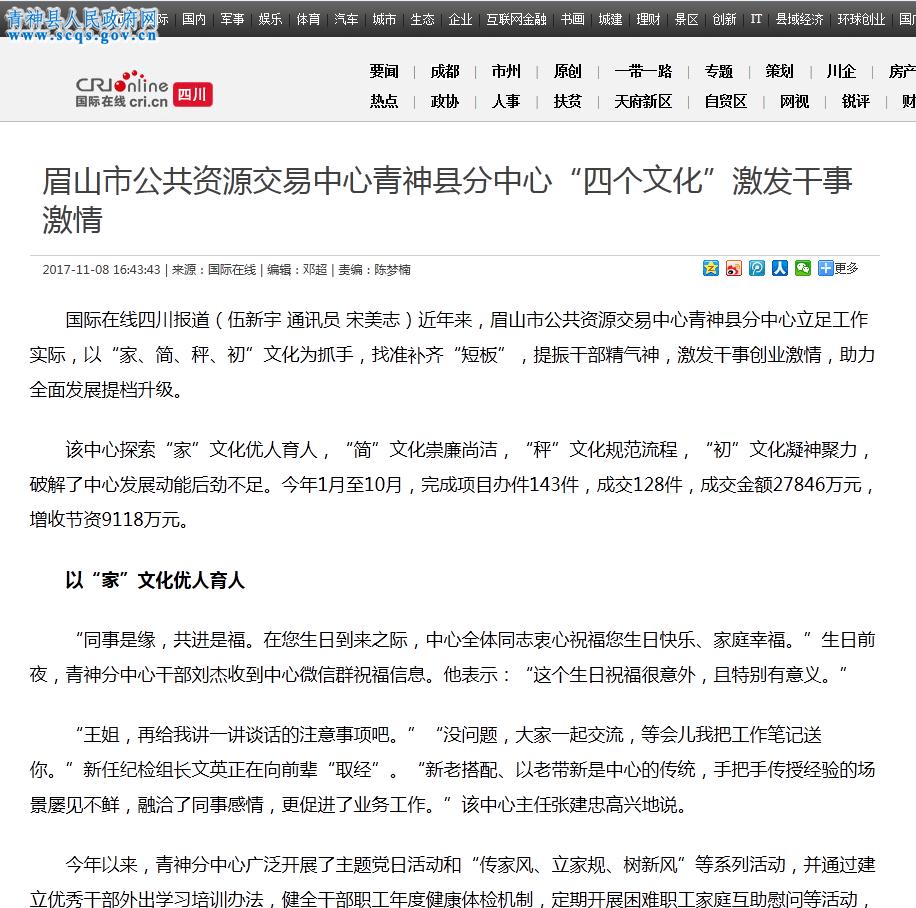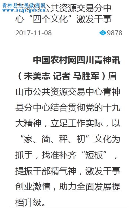 近日,市交易中心青神县分中心结合贯彻党的十九大精神,立足工作实际,积极探索、大胆创新,分别从“‘家’文化优人育人、‘简’文化崇廉尚洁、‘秤’文化转变作风、‘初’文化凝神聚力”四个方面打造“家、简、秤、初”特色机关文化。中心撰写的“涵养机关文化增创发展动能”外宣稿件被国际在线四川频道、中国农村网四川频道、四川在线、中国网锦绣天府等省内主流网媒刊载。