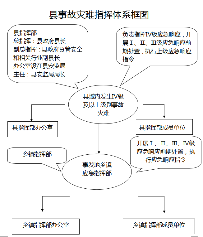 县政府是全县事故灾难应急管理工作的行政领导机构,研究决定、部署和推动全县事故灾难应急管理工作。成立县事故灾难应急指挥部(以下简称“县指挥部”),负责事故灾难的指挥和协调。县指挥部办公室设在县安监局,办公室主任由县安监局局长担任。