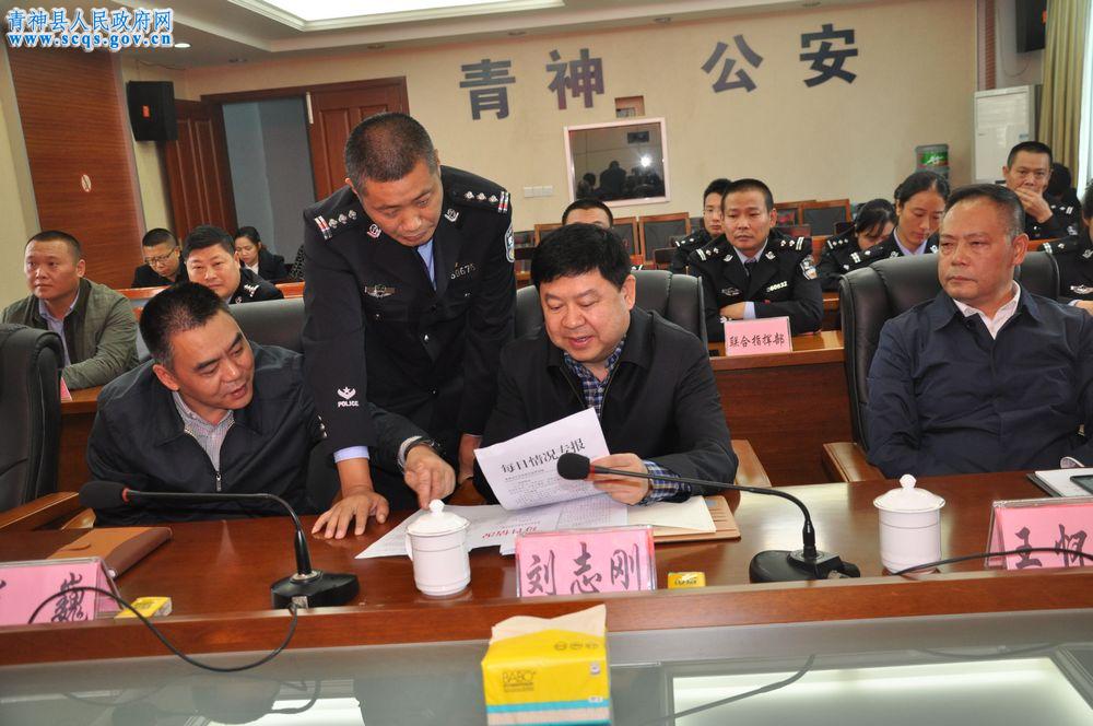 省厅党委委员、副厅长刘志刚(前排右二)率省委维稳工作集中督查第十七督查组,在青神县局参加全省视频调度会,指导青神维稳安保工作。