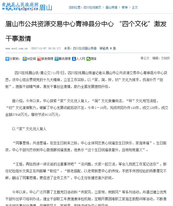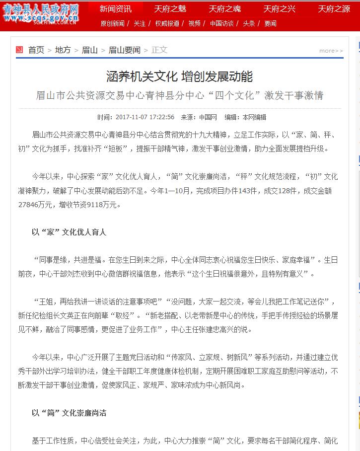 近日,市交易中心青神县分中心结合贯彻党的十九大精神,立足工作实际,积极探索、大胆创新,分别从“‘家’文化优人育人、‘简’文化崇廉尚洁、‘秤’文化转变作风、‘初’文化凝神聚力”四个方面打造“家、简、秤、初”特色机关文化。中心撰写的“涵养机关文化增创发展动能”外宣稿件被国际在线四川频道、中国农村网四川频道、四川在线、中国网锦绣天府等省内主流网媒刊载。