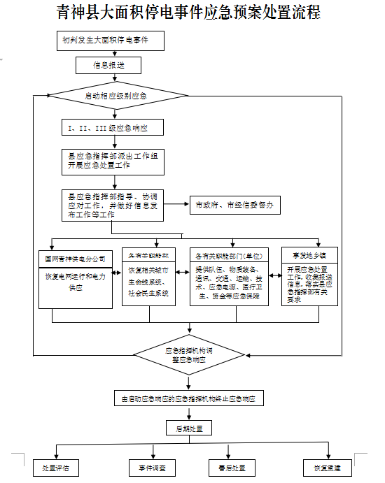 按照分层分区、统一协调、各负其责的原则建立事故应急处置体系。电网企业按照电网结构和调控管辖范围,制订和完善电网应急处置和恢复预案,保证电网尽快恢复供电。发电企业完善“保厂用电”措施,确保机组的启动能力和电厂自身安全。电力用户根据重要程度,自备必要的保安措施,避免在突然停电情况下发生次生灾害。县级有关部门按各自职责,组织做好大面积停电事件应急准备和处置工作。